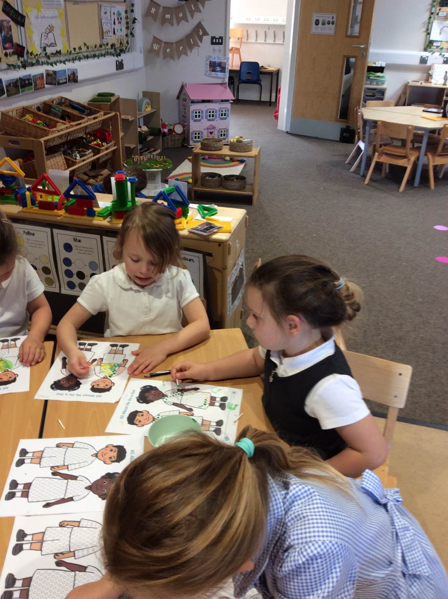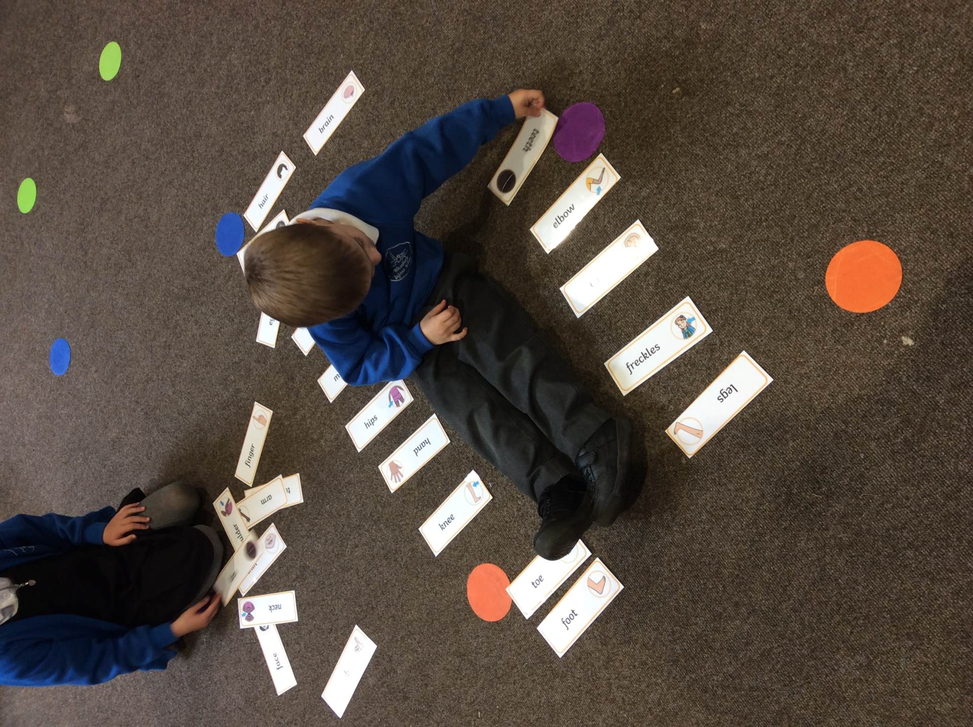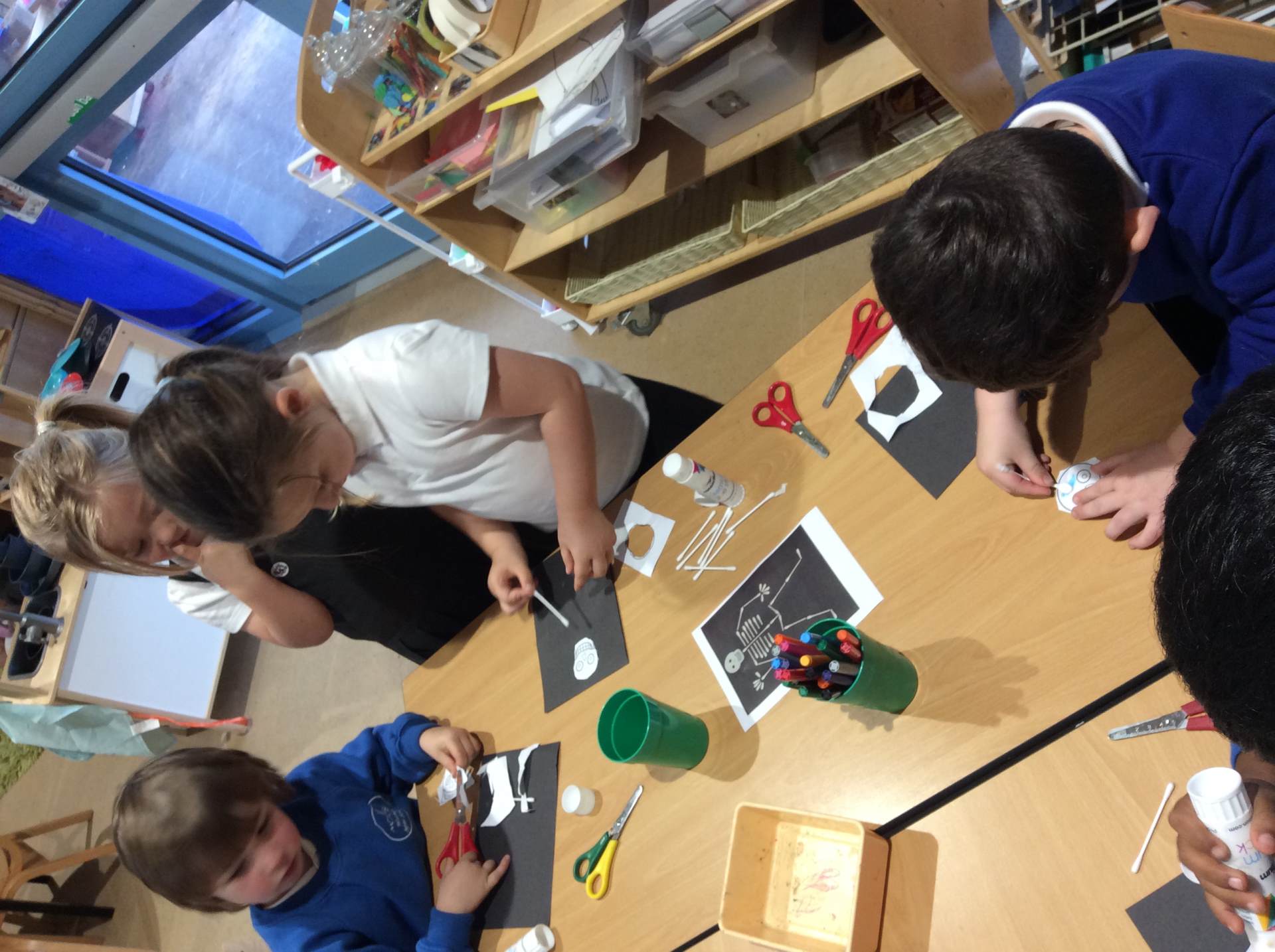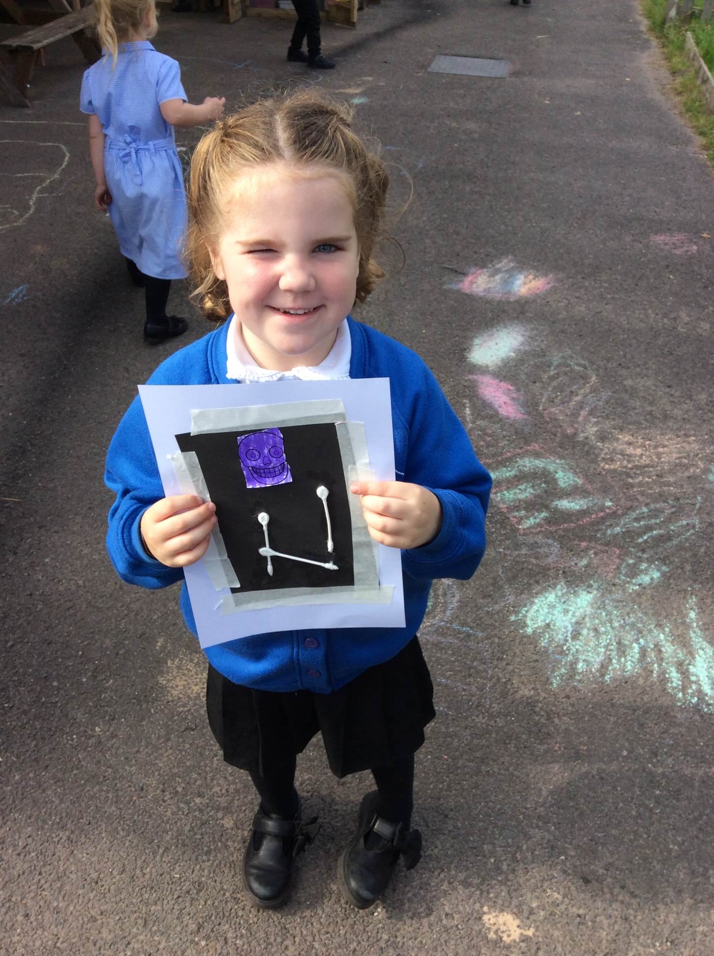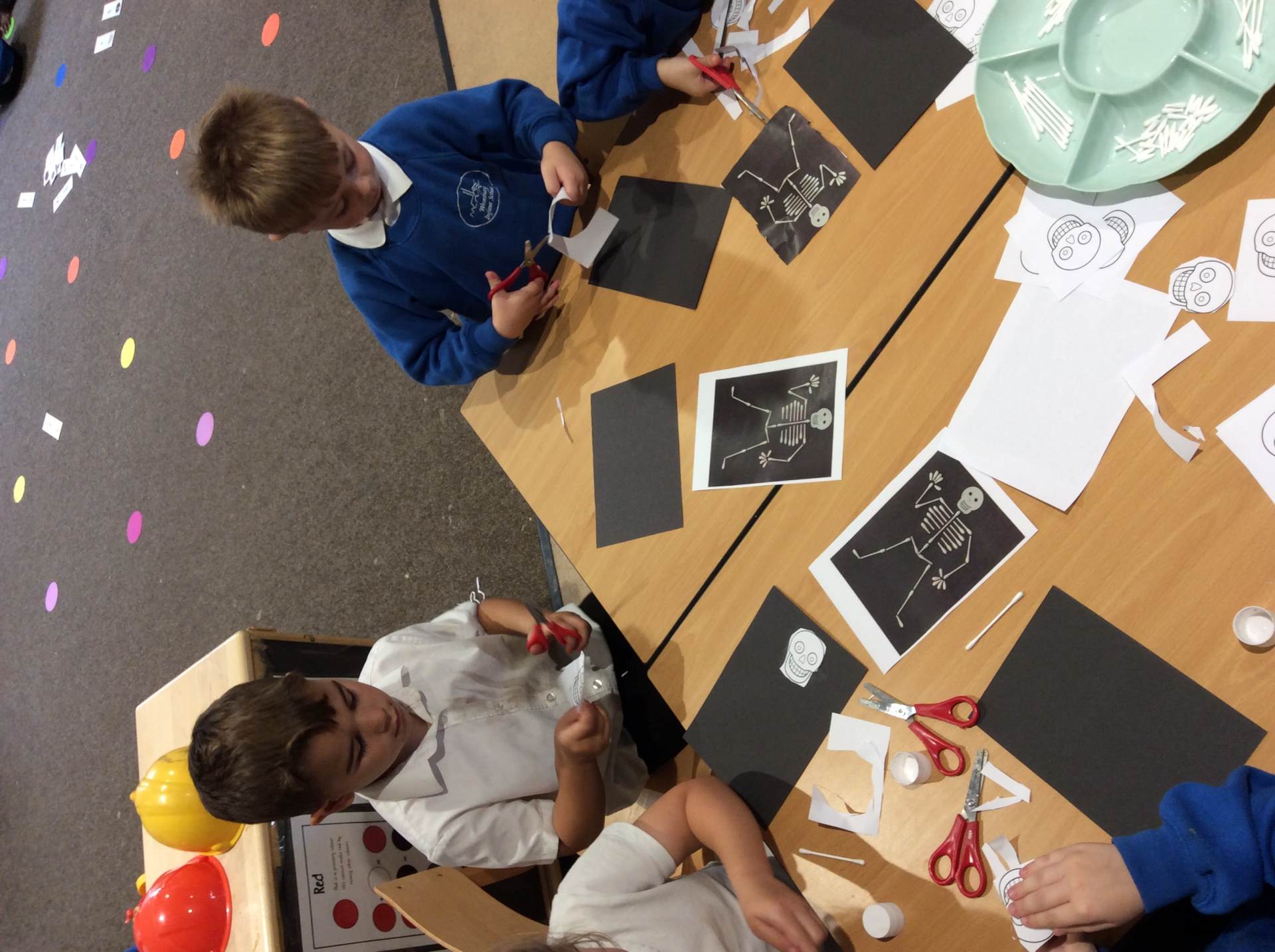 This week our theme has been our body and keeping healthy. We have enjoyed singing songs such as head, shoulders, knees and toes and naming different body parts and a skeleton song called ‘Dem bones’. This led into us making skeleton pictures using cotton buds and black paper. We also enjoyed listening to the story ‘Funny bones’ and talking to our partners about what we would do if we were skeletons! Lots of children enjoyed drawing around their bodies on the floor with chalk or on large sheets of paper and naming / labelling the different body parts. We thought about and talked as a class about what we need to do to be healthy and to live a healthy lifestyle. There were lots of great ideas!