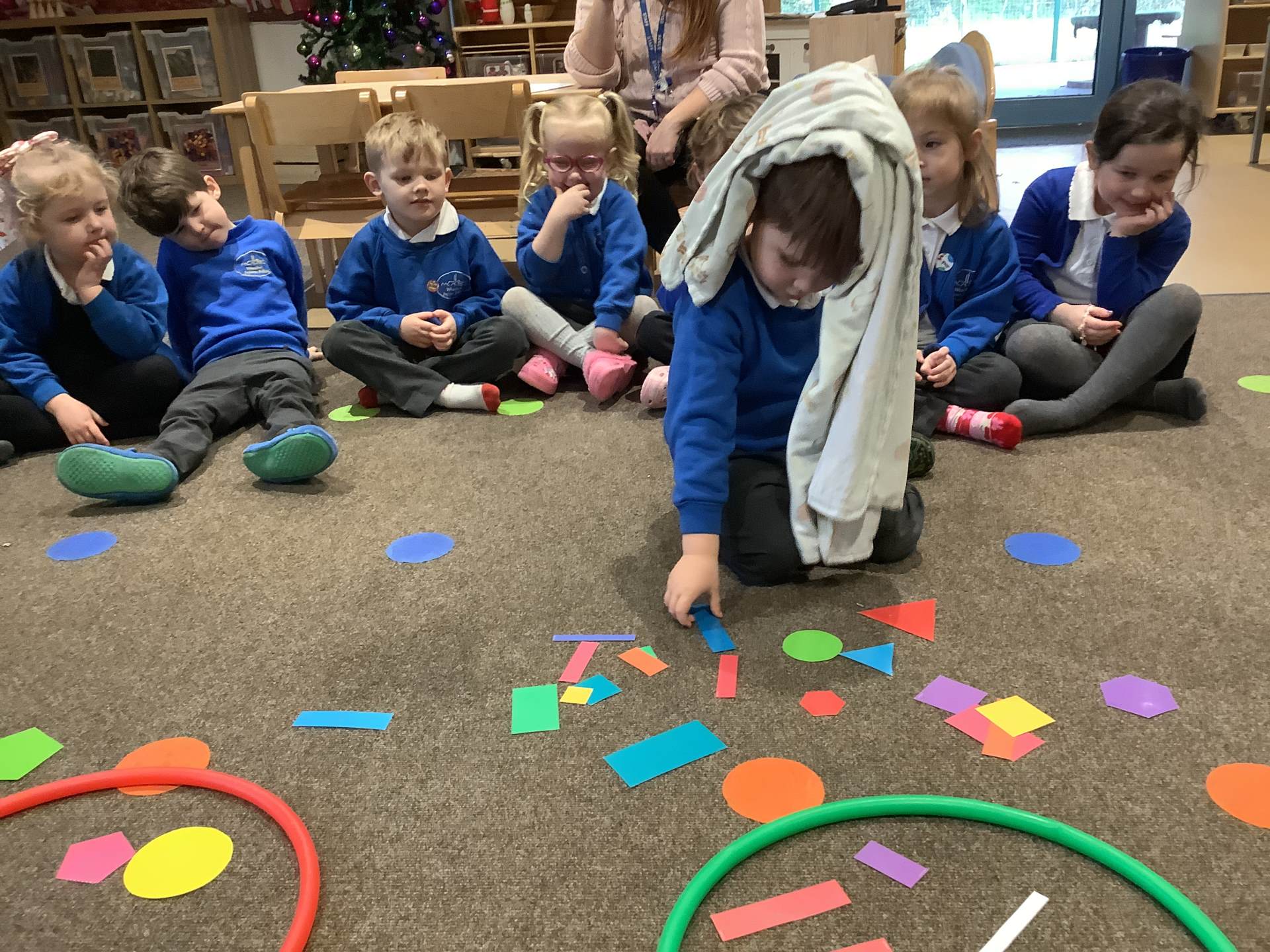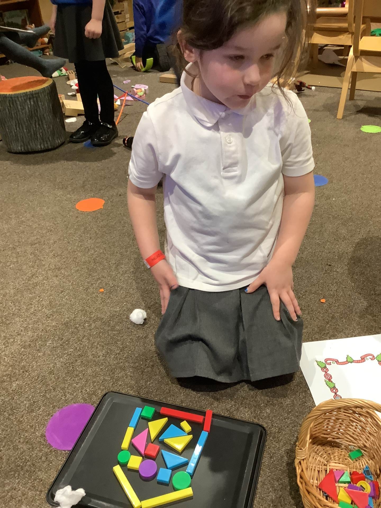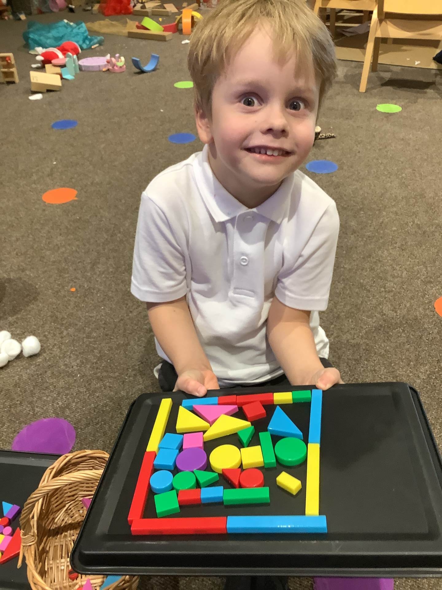 The children have also been learning about four-sided shapes. They enjoyed being shape detectives and searching for rectangles in our environment. They took part in a sorting activity, grouping shapes into those with four sides and those without, and learned that a square is a special type of rectangle because its sides are all the same length. When the children were confident with the shapes they then had the opportunity to use these in their play to create a shape picture. The children then explored how shapes fit together and were excited to discover that two triangles can make a square. At the end of the week, we learned about day and night and talked about the different things that happen at each time of day. The children shared their ideas about daily routines, such as getting ready for school in the morning and going to bed at night.