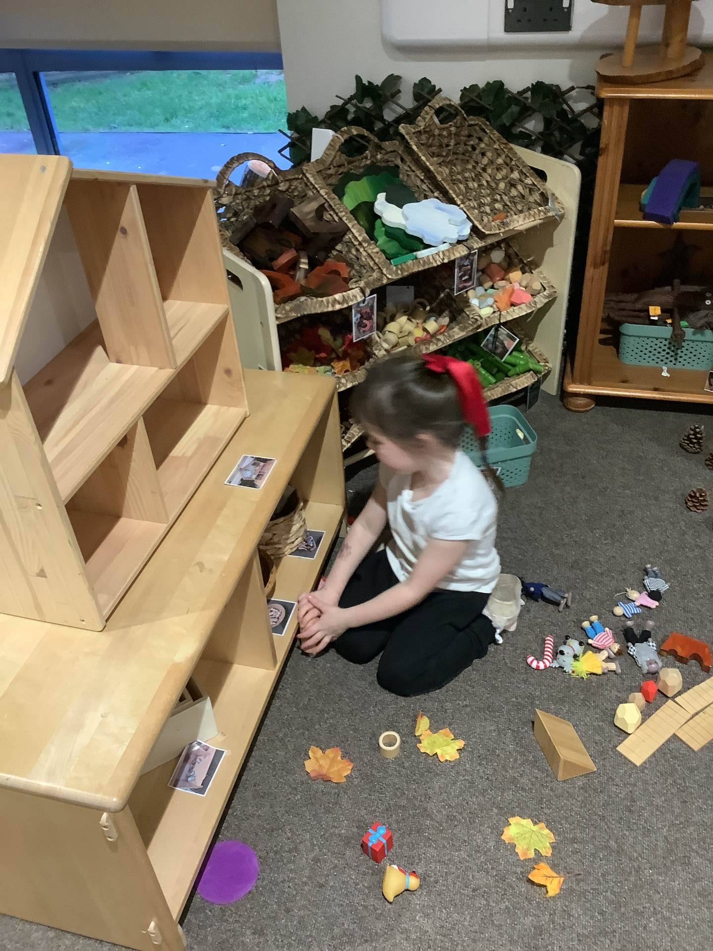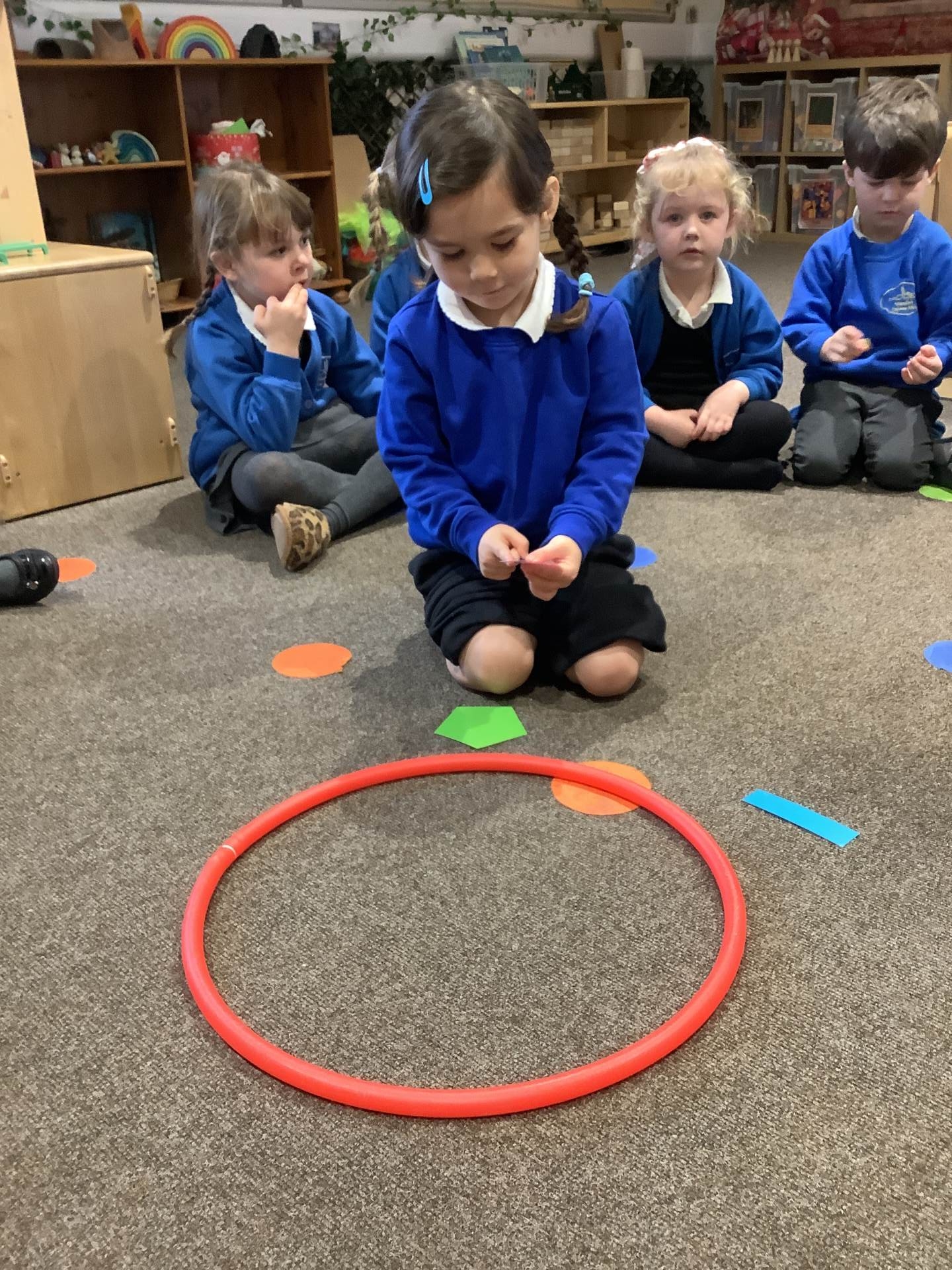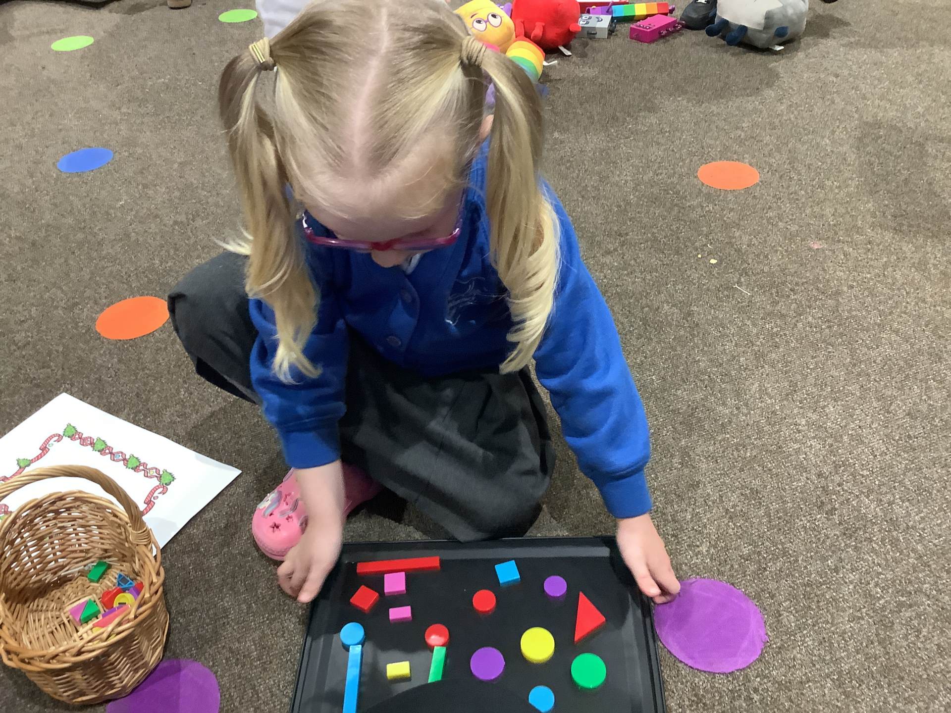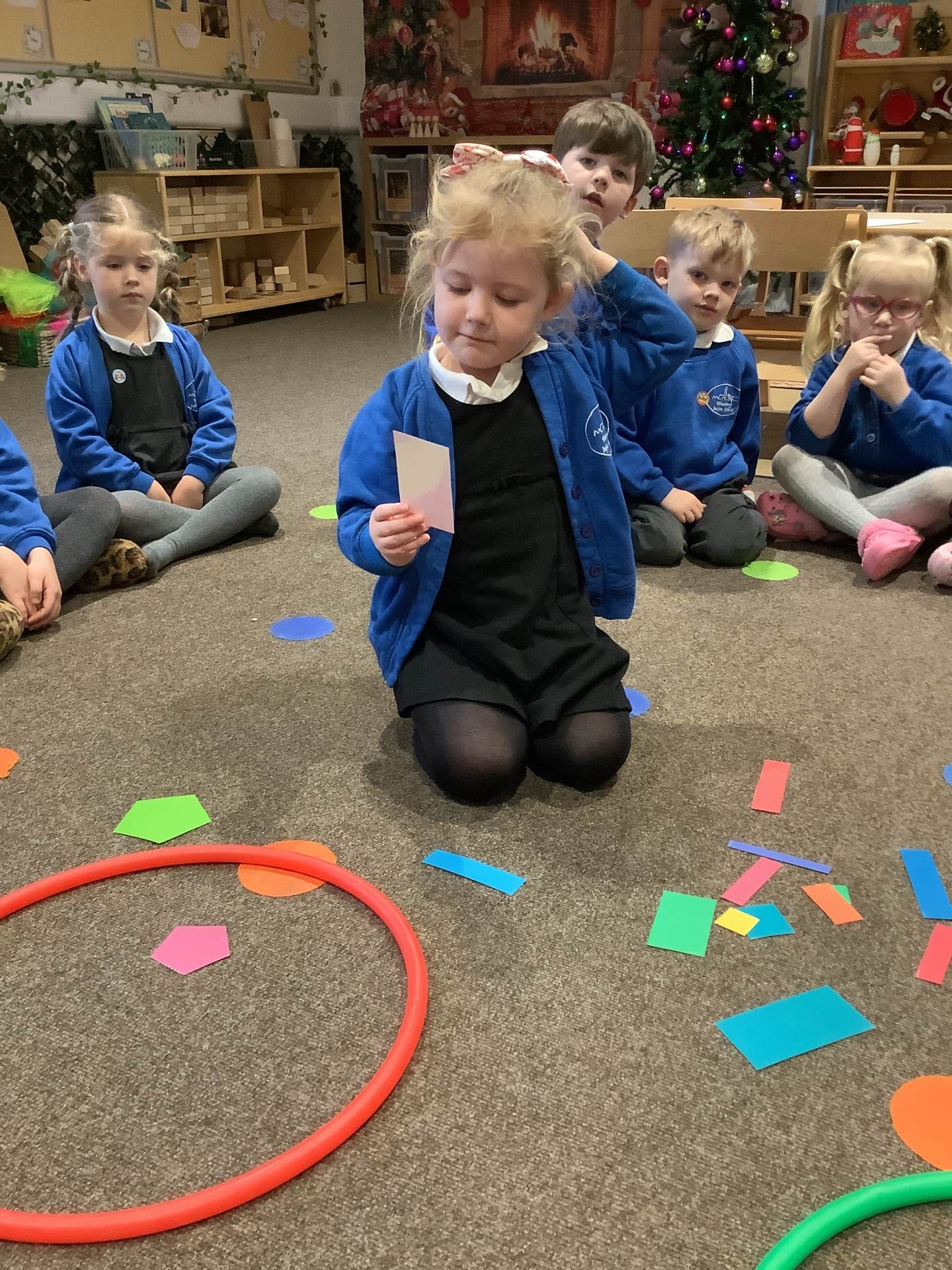 The children have also been learning about four-sided shapes. They enjoyed being shape detectives and searching for rectangles in our environment. They took part in a sorting activity, grouping shapes into those with four sides and those without, and learned that a square is a special type of rectangle because its sides are all the same length. When the children were confident with the shapes they then had the opportunity to use these in their play to create a shape picture. The children then explored how shapes fit together and were excited to discover that two triangles can make a square. At the end of the week, we learned about day and night and talked about the different things that happen at each time of day. The children shared their ideas about daily routines, such as getting ready for school in the morning and going to bed at night.