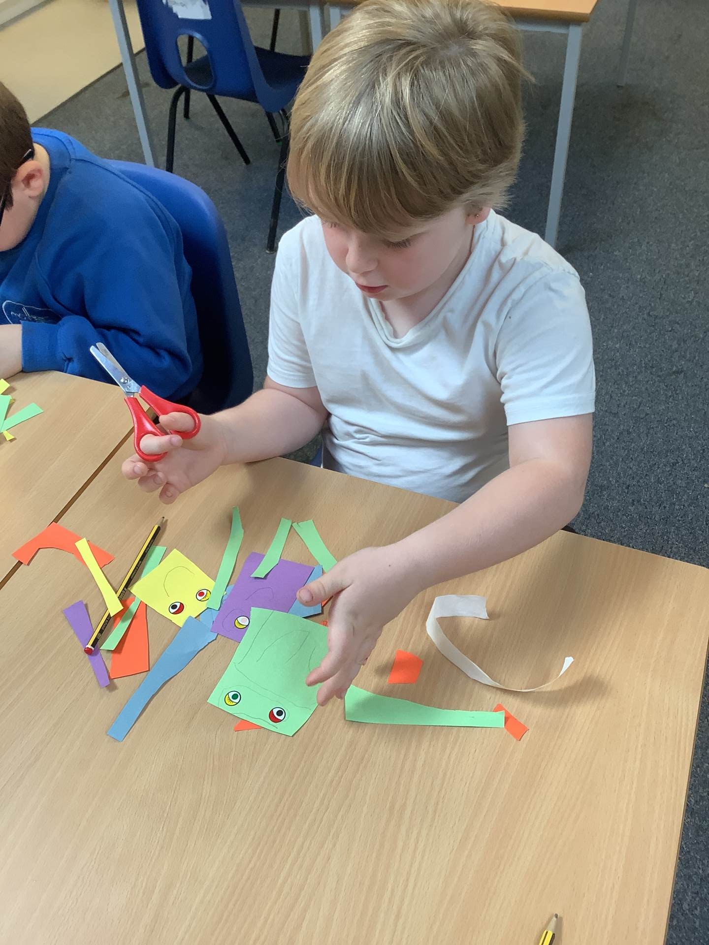 In maths, the class has been working on two different learning focuses. Some of us have been exploring part-whole models and number bonds. A part-whole model helps children understand how numbers can be split into parts. For example, 10 can be made from 5 and 5, or 6 and 4. These models help lay the foundations for understanding addition and subtraction. We used a range of resources such as 2-sided counters, cubes and Numicon to find different ways to make a number like 10. Some of us even used these number bonds to create addition fact families, showing how the same numbers can make different number sentences.