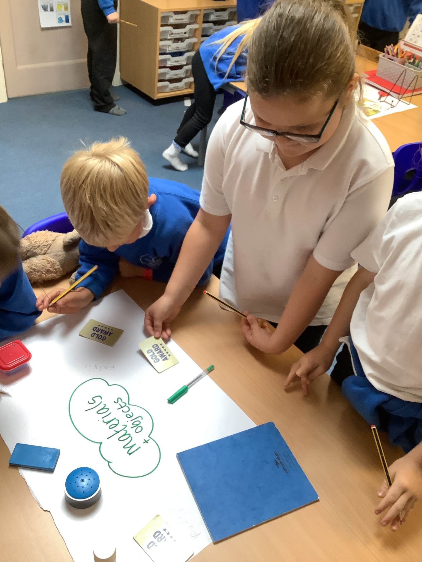 Our new science topic is ‘Materials’. We have engaged in some very practical learning; collecting objects and identifying what they are made from. We found out that some objects are made from more than one material, and when we took a calculator apart we realised there where hidden materials inside. I was excited to show the children my new foil slippers but they quickly told me it was not a suitable material for a slipper so we pinned it to our working wall to remind us of properties required so objects are fit for purpose. The children also took their learning outside to see what materials we could see and touch around our school. We will continuing investigating next week.